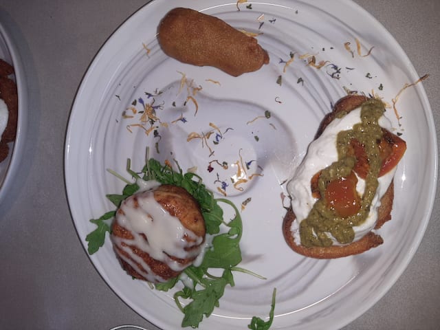 Melanzane grigliate, mozzarella fior di latte, pomodorini semi secchi, scaglie di grane e mente.