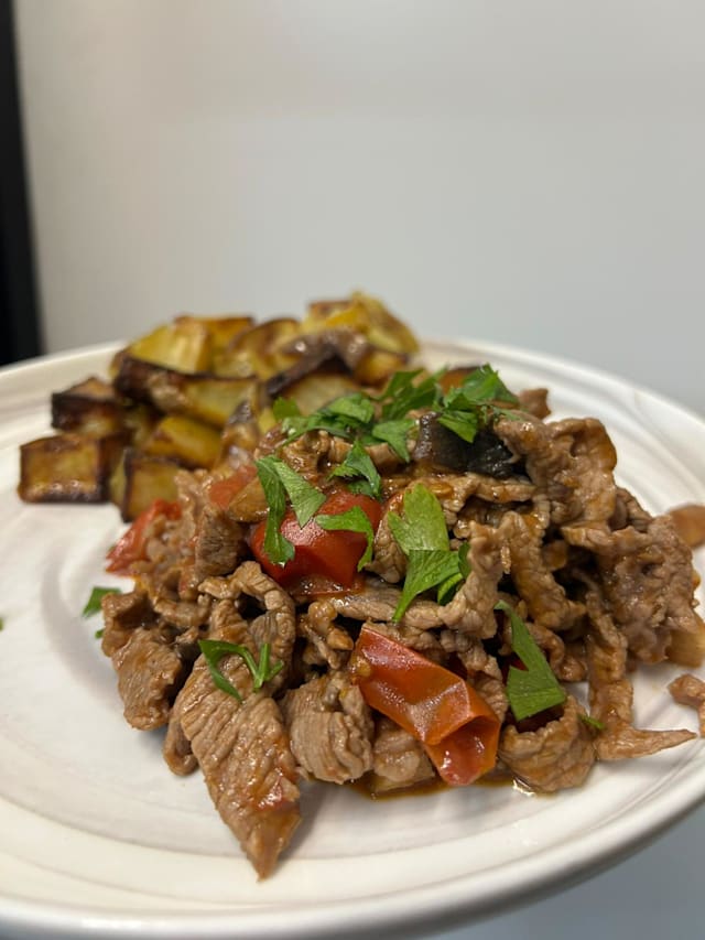 Straccetti di manzo, rucola, melanzane fritte e stracciatella.