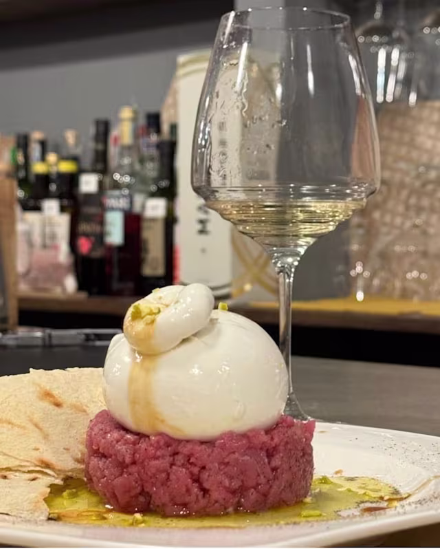 - Battuta a coltello di scottona, olio, sale, peре, burratina e granella di pistacchio