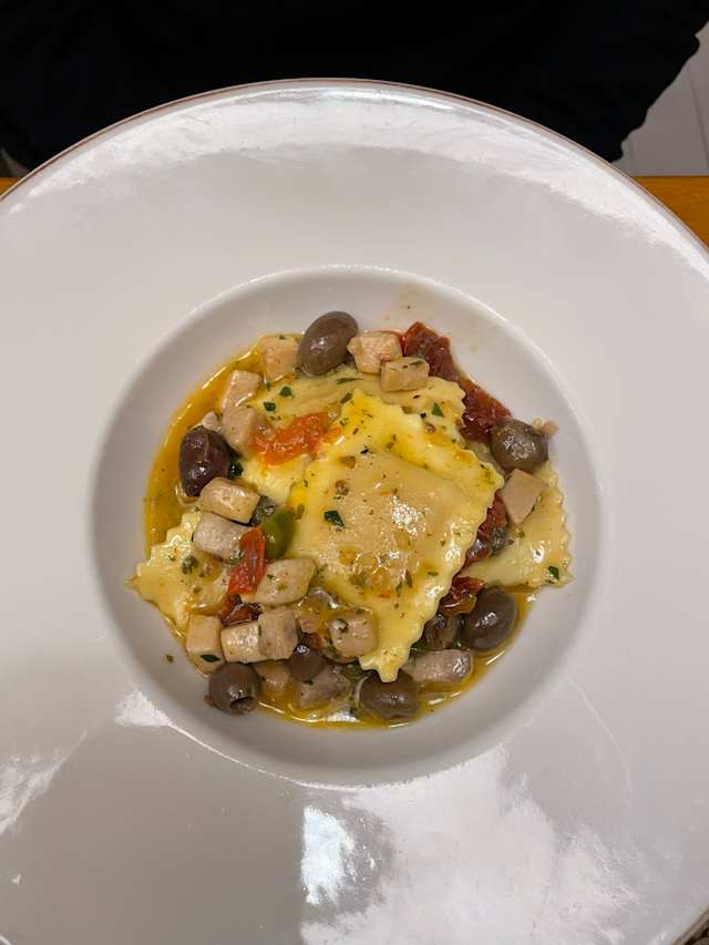 - Ravioli ricotta e spinaci con ragù bianco alla cacciatora e topinabur