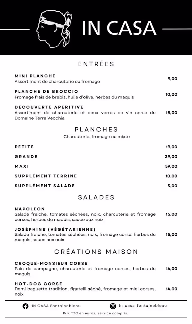 Our evening began with a warm welcome and our choice of table. There is a plat du jour and a small selection of Corsican specialities and wines. The food was delicious, good presentation and generous portions. When in Fontainebleau, we’ll return. Delightful evening with great food and delightful atmosphere.