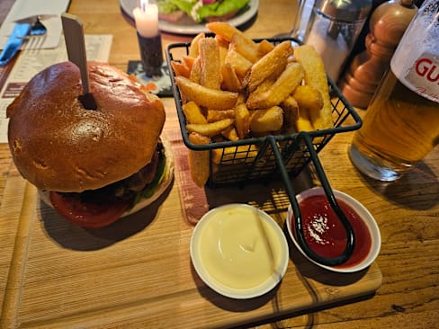 5.5/10Nice ambience but very loud in the main dining room. Service was very slow, it took 30 minutes to get the menu, 15 minutes before they came back to take the order and then another 30 minutes until the food arrived. In all fairness though, they had a full house including a large group that probably drained their resources a bit. Food was ok, we had the burgers that were a bit tasteless but well made.