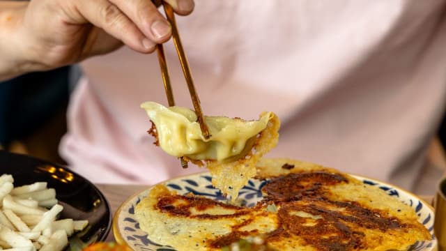 Raviolis au poulet, sauce maison, crème, kimchi