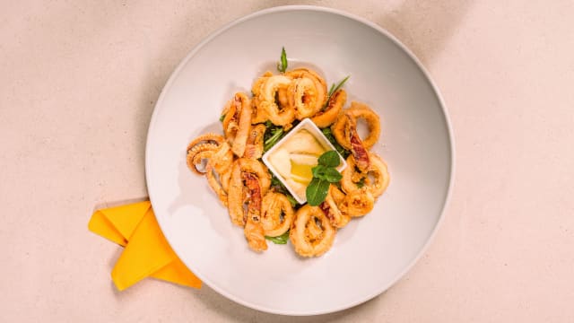 Calamari e gamberi fritti con maionese al basilico.