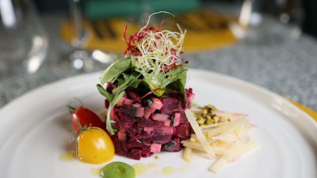 Brunois di rapa rossa e zucchine, misticanza di campo, pistacchi di bronte tostati, lamelle di grana padana DOP, mayo, tabasco, senape, salsa worcester, frutta di stagione