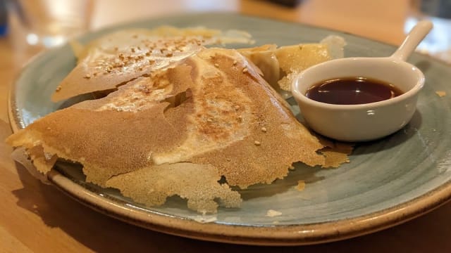 Dimsum di totano sfoglia allo zafferano accompagnato alla salsa di soia fatta in casa.