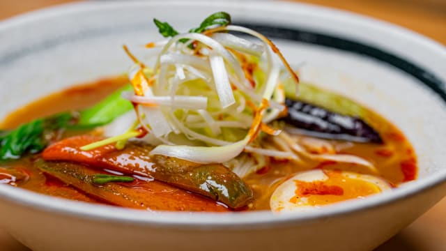 Ramen in brodo a base di miso e verdure, salsa spicy, uovo marinato, bambù, cipollotti, cavoli cinesi, peperoni, porro, cipolla fritta.