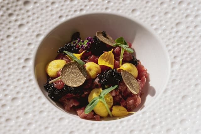 Filetto di manzo con carote baby, bietola, demi-glace al nero d'avola, tartufo nero