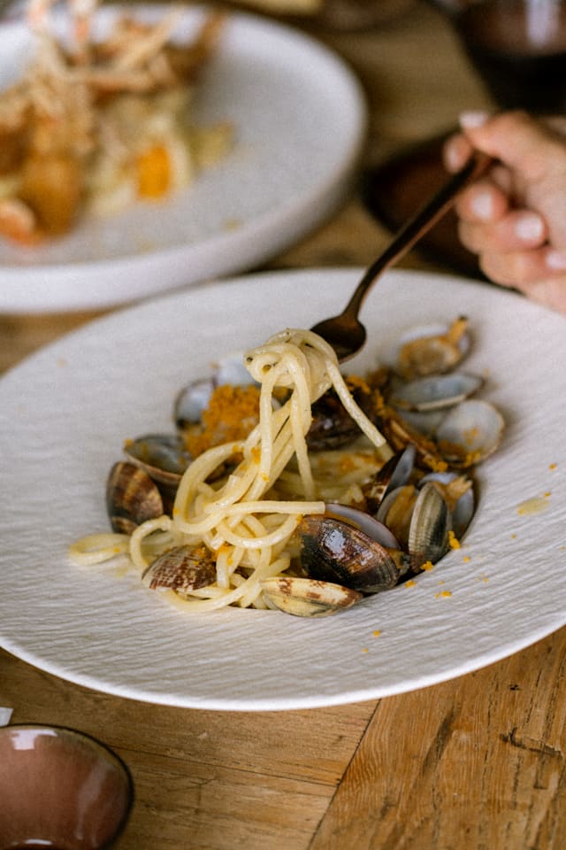 Tagliolini al burro di acciughe, tartare di tonno, caviale di lime