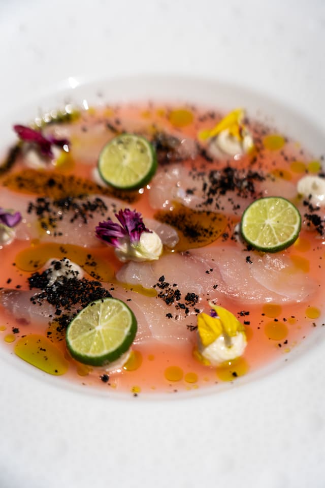 Ravioli ripieni di branzino in acqua di mare profumata agli agrumi