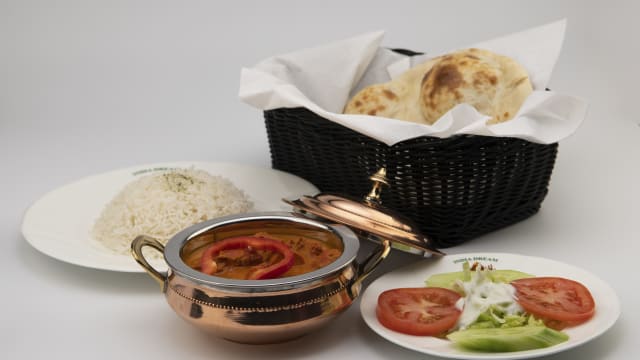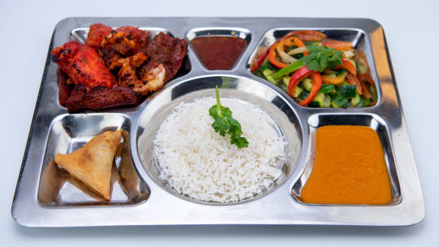 - Somosa med mintsås, marinerade och grillade jätteräkor, lamm och kycklingfilé, tikka masala sås