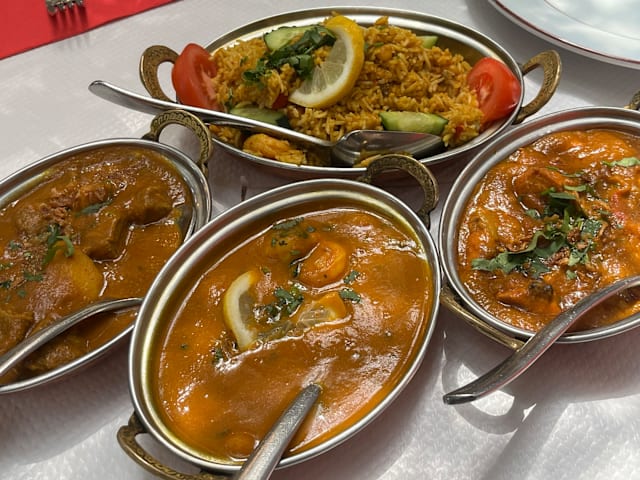 7/10We booked with the Fork Festival promotion, expecting, as indicated, that we would be able to order without restriction from the a la carte menu. No "menus". We were thus surprised when the waiter insisted that because of the Fork promotion, we were REQUIRED to order an appetizer as well as a main course. Having just come from a cocktail party, we were not interested in ordering an appetizer. Eventually, the waiter permitted us to order a dessert in place of the appetizer. Chicken Korma was very nice and tasty. Chicken Vindaloo, normally a very spicy dish, had no "heat" at all. Unlike Indian restaurants we're used to, rice was charged at 3-4€ additional per person. While the dining area was pleasant and clean, we could not rate Atmosphere higher because the toilet area was not very clean and there was no hot water or soap. The blow drier was basically unusable because the temperature was high enough to burn one's hands. Sadly, another "wipe-hands-on-pants" experience.