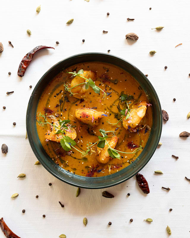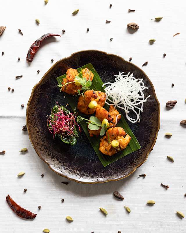 - Gambas marinées et grillées au tandoor.