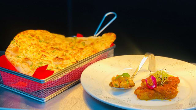 Delightful fusion dish combines the traditional naan with creamy italian burrata cheese with mint sauce and homemade dried tomatoes.