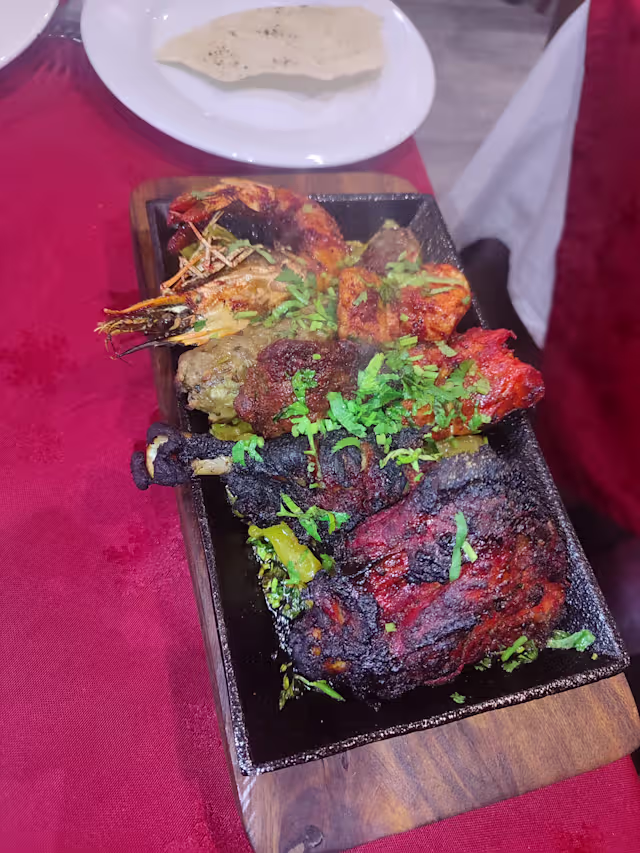 - Assortiment de viandes, poulet tikka, agneau tikka, seekh kabab, poisson tikka