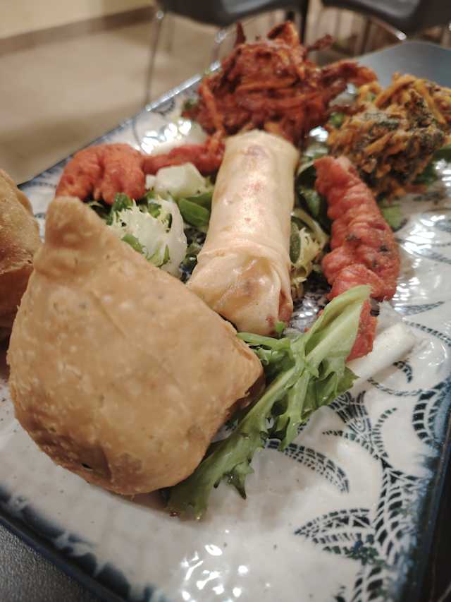- Cheese roll, pakora, samosa, onion bhaji, chicken pakora