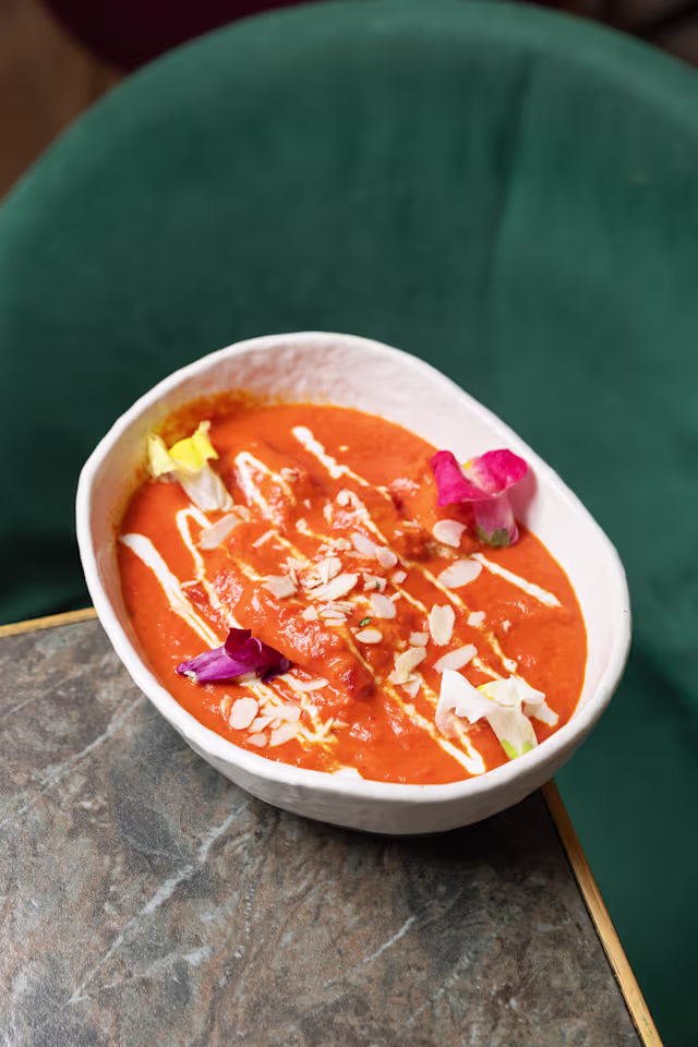 - Salsa de tomate, especias hindús, ajo, jengibre y cilantro