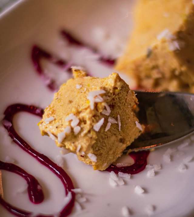 - Senapsmarinerad lax på en bädd av grönsaker, toppad med kryddning, friterad spenat, rostad sesam frön, mango i tomat och cashewnötsblandning grönsaksbuljongsås.