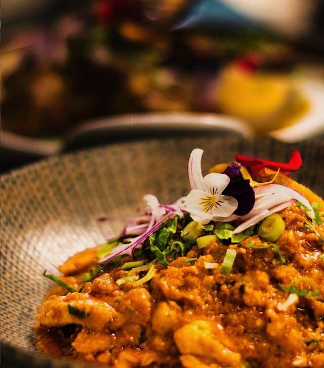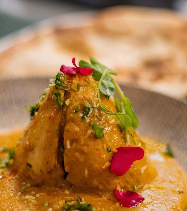 - Kryddmarinerad och grillad kycklingbröstfilégryta med mango, stekt lök, paprika, tomat, friterad lök, ingefära, färsk koriander, garam masala och chilipickles i en tomat- och cashewnötsblandad grönsaksbuljong med currysås.