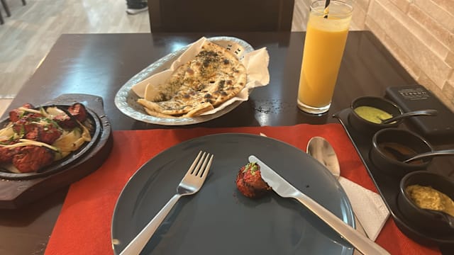 10/10Had a lovely meal at this small-sized restaurant. We had the chicken tikka & a paneer cheese with spinach dish, garlic naan and mango ice cream for dessert - all was delicious and of good quality. Portions on the small size but was enough for us. Highly recommended.