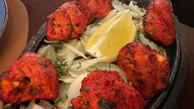 - Pollo asado al horno tandoor con pimientos, cebolla y una salsa especial de tomates.