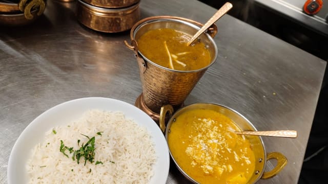 Pollo preparato in salsa orientale e spezie “methi”, foglie di fieno greco con riso basmati.