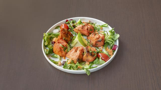 Poulet mainé grillé au tandoor, servi avec une sauce tomate et gingembre parsemés de coriandre