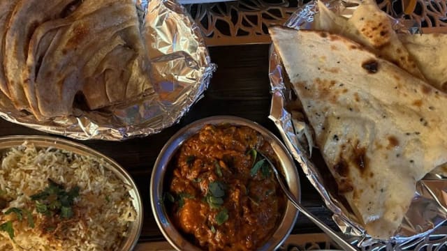 Iconisch indiaas gerecht met malse kip in een fluweelzachte, gouden currysaus verrijkt met cashewnoten. Geserveerd met keuze uit geurige basmatirijst of een plain naan.