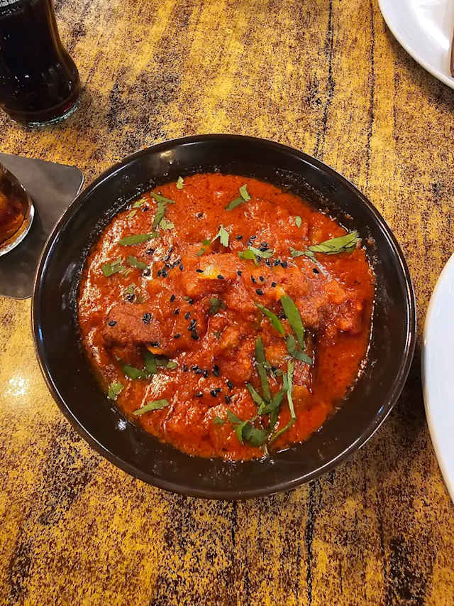 - Trozos de pollo marinados en yogur, menta y asados en tandoor.
