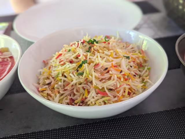 - Arroz basmati con especias, frutos secos, hierbas aromáticas y servido con salsa curry