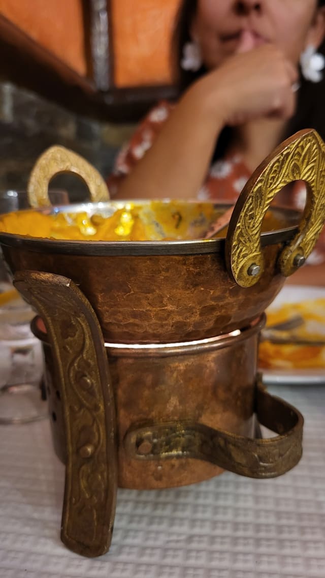 Borrego feito em frigideira indiana com cebola e tomate