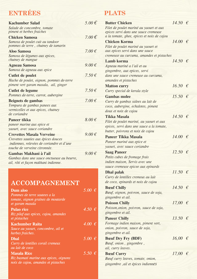10/10Great restaurant, amazing food, very polite, helpful and cheerful owner(girl). Really liked how she helped us with menu and customisation of the curry. Highly recommend. Food taste is also great. Overall a very warm and amazing Indian restaurant in Paris ❤️