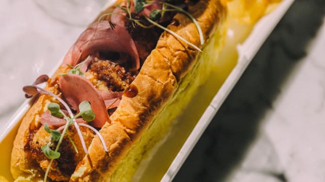Brioche de carrillada a baja temperatura con baba ganoush, salsa tonkatsu y cebolla encurtida