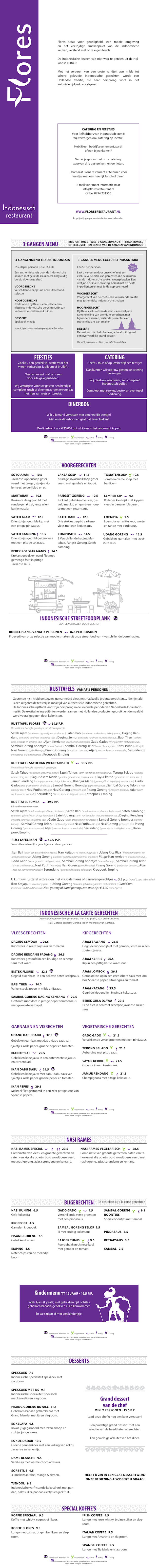 Flores staat voor gezelligheid, een mooie omgeving en het veelzijdige smakenpalet van de Indonesische keuken, versterkt met onze eigen touch. De Indonesische keuken valt niet weg te denken uit de Hollandse cultuur. Met het serveren van een grote variëteit aan milde tot scherp gekruide Indonesische g...