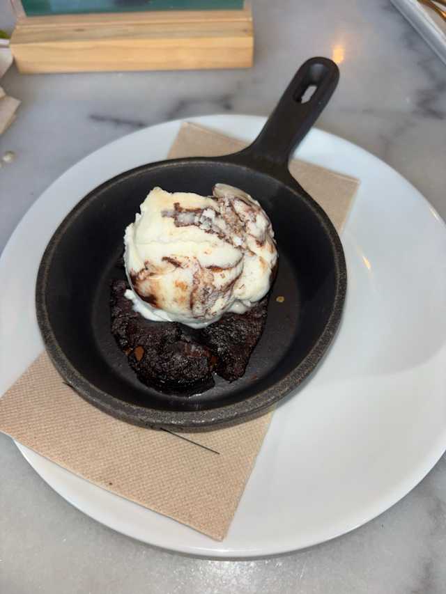 - Tierna galleta de chocolate recién horneada, culminada con una bola de helado de stracciatella.