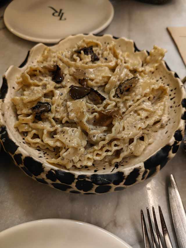 - Mafaldine, salsa de pecorino romano, salsa tartufata y trufa laminada servida en rueda de queso pecorino.