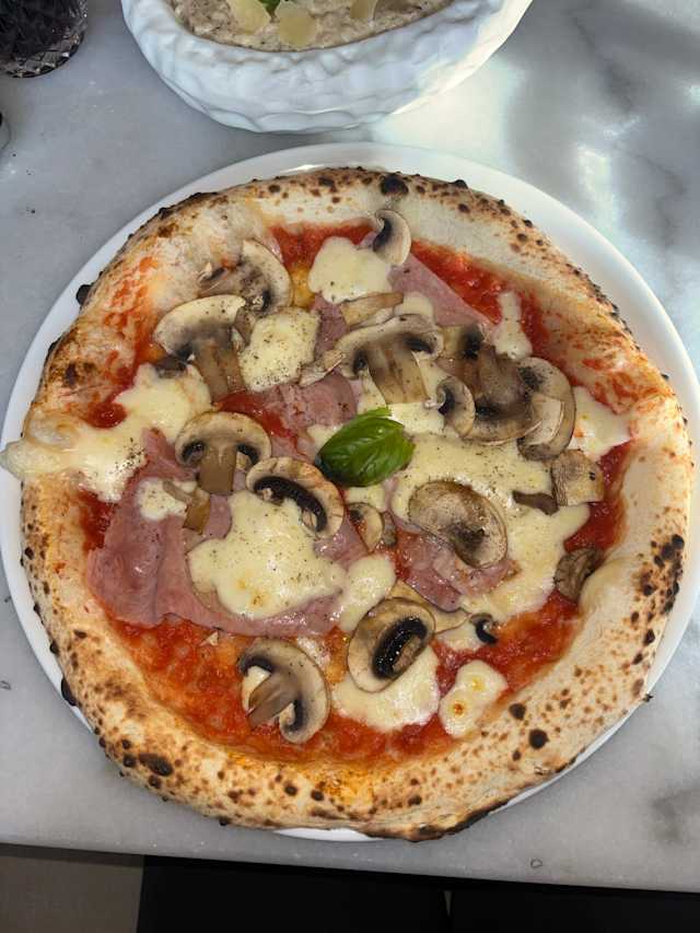 - Tomate san marzano, 100% mozzarella, finas lonchas de prosciutto cotto, parmesano en polvo y champiñones frescos. Una pizza para todos los paladares.