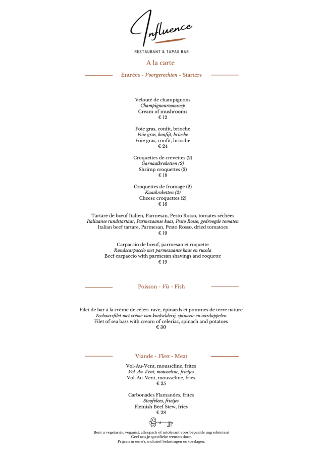 Dear Joe, Thank you for your review. We apologize for any confusion regarding our menu offerings. Between 15:00 and 22:00, we currently serve only tapas dishes. We are working on putting together an à la carte menu for the future to offer our guests an even better choice of dishes to enjoy. Our restaurant is indeed located within the Juliana Hotel Brussels, and we welcome both hotel guests and outside visitors. We hope to have the opportunity to provide you in the future with an improved dining experience. Kind regards, Team Juliana Restaurant Brussels