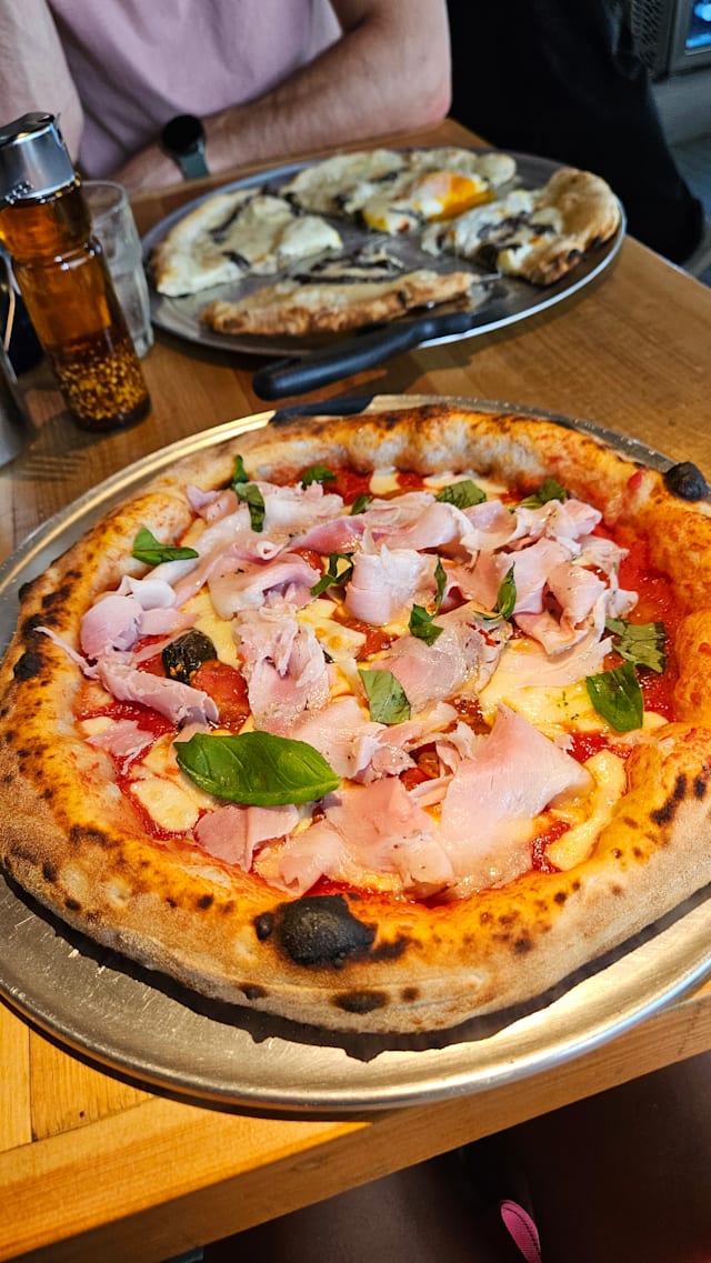 Organic tomato, fior di latte, prosciutto cotto and basil