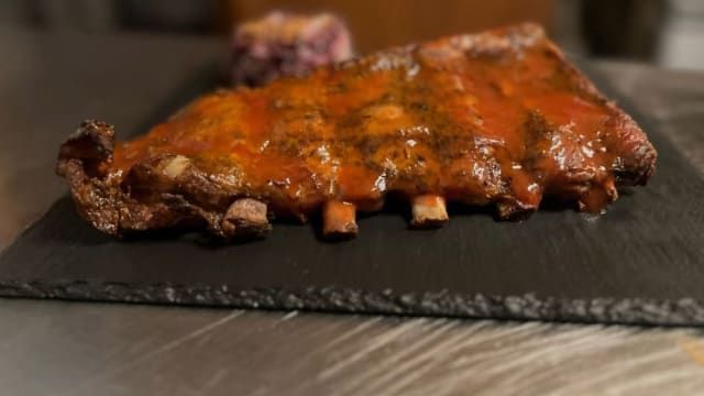 Degustazione di carni cotte a bassa temperatura: 1 lollipop (coscia di pollo avvolta nella pancetta), 1/4 di ribs, 1 salsiccia affumicata, pancia di maiale, brisket, pulled pork e chicken.
