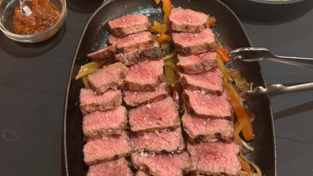 Carne de angus madurada a la brasa, sobre base de verduras, acompañado de 6 tortillas de trigo, salsa roja y verde