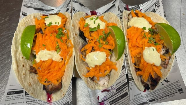 Torta de trigo, pollo a la brasa, zanahoria encurtida en lima, col morada en tequila, mayonesa de jalapeño y cilantro