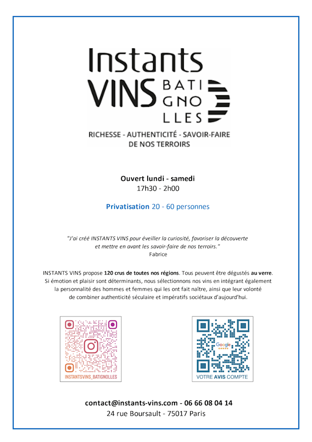 Yes, Instants Vins Batignolles has availability on TheFork currently. Do not hesitate, reserve your table on TheFork!