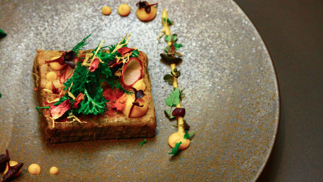 Champignons de saison, œuf cuit à basse température, éclats de noisettes et crumble à l’ encre de seiche