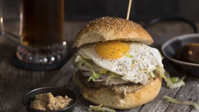 - Hamburger della casa (200gr), crema di porcini e tartufo, lardo di suino nero dei nebrodi, pecorino siciliano, lattuga, uovo fritto