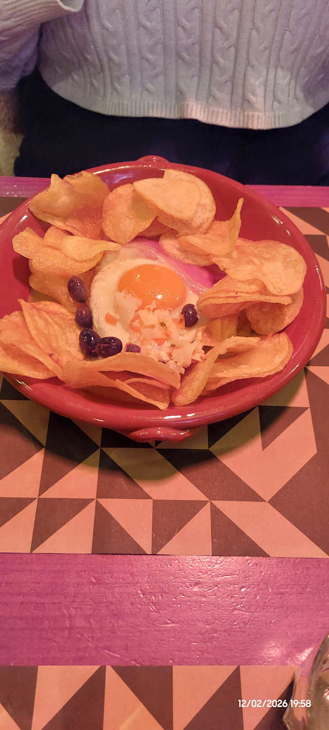 - Batata palito com ovo estrelado, presunto e coentros