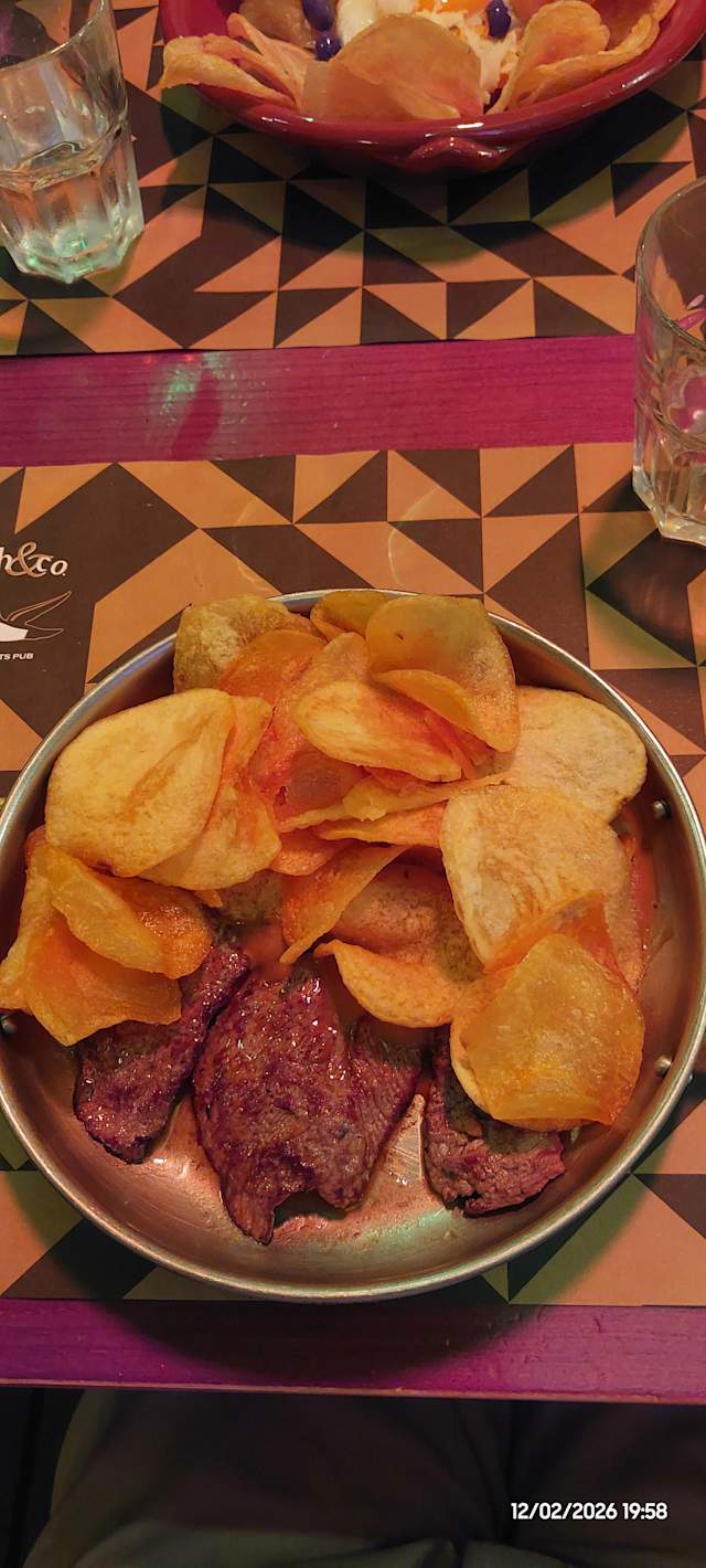 - 200 gr. de carne de vitelo frita em vinho branco, alho e louro, servido na frigideira com batata frita às rodelas, presunto e ovo estrelado