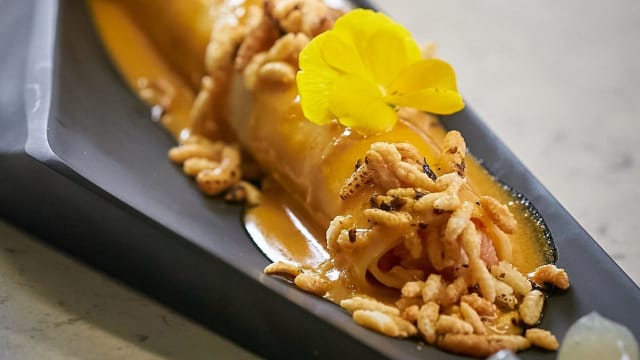- Carrilleras al vino, parmentier de patata, bechamel de coco