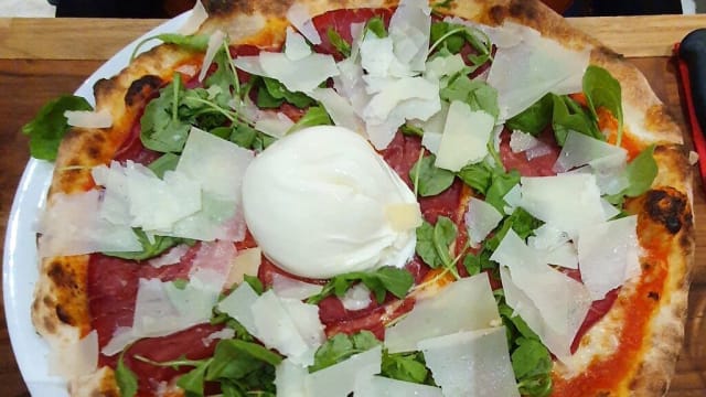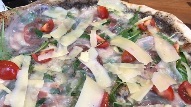 Crème de truffe, fior di latte, pancetta à la truffe noire, copeaux de Parmesan, roquette, tomates cerises