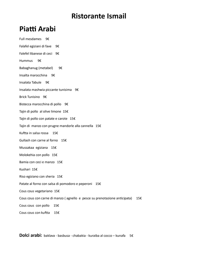 Presso il ristorte NON SI VENDONO ALCOLICI come da tradizione Mussulmana. (HALAL) E' consentio agli amici italiani di portare il loro vino se vogliono.